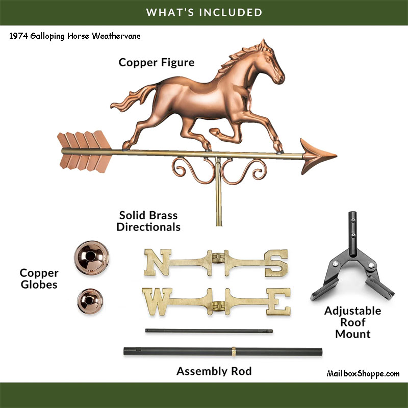 Full size weathervanes include the ornament, the directionals (N-S-E-W), and the approx 18″ long 3/4″ rod everything assembles over.  In some cases, when mounting the weathervane in a cupola 30″ or wider, you will need the 11″ extension rod in order to reach the mounting bracket below the peak inside most cupolas.