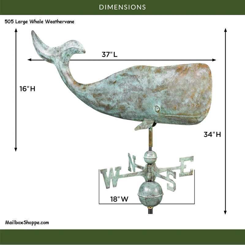 Bring the majestic beauty of a whale to your outdoor space with our 37″ Whale Weathervane! Crafted from pure copper and finished in a beautiful Verde patina, this exquisite piece exudes a peaceful serenity. From its long fin to its deep eyes, every detail has been captured with stunning accuracy. This weathervane is sure to become a cherished feature in any garden, patio or roof. Let this majestic creature add a wonder of the ocean to your home, and bring a touch of maritime magic into your life. Enjoy its graceful beauty for years to come!