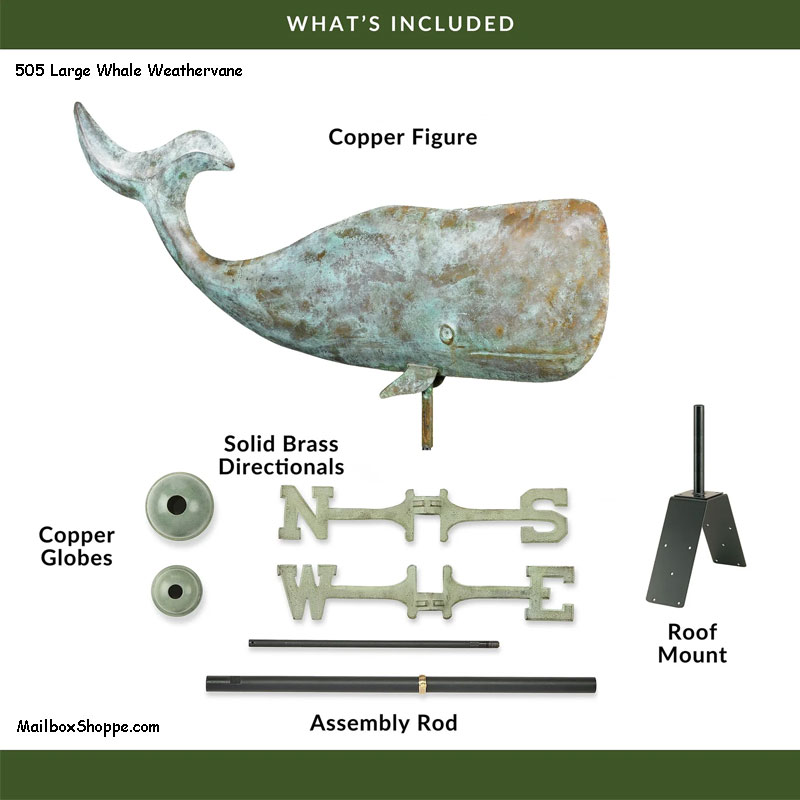 Full size weathervanes include the ornament, the directionals (N-S-E-W), and the approx 18″ long 3/4″ rod everything assembles over. In some cases, when mounting the weathervane in a cupola 30″ or wider, you will need the 11″ extension rod in order to reach the mounting bracket below the peak inside most cupolas.