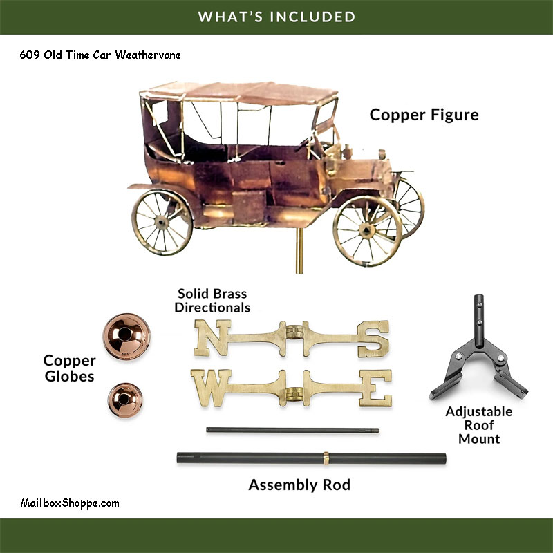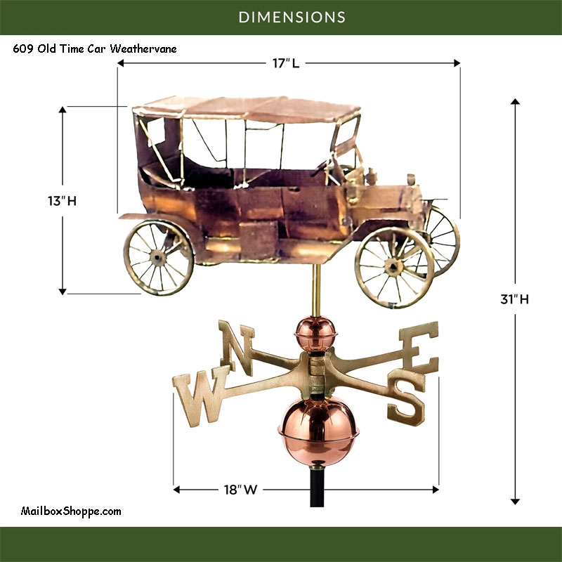 Add nostalgic flair to your home or garden with this beautifully crafted Old Tyme Car Weathervane. Featuring a classic vintage automobile silhouette, it’s the perfect tribute to the golden age of motoring. Since 1982 Good Directions pure copper weathervanes have been unsurpassed in style, quality, and durability “ perfect for the house-proud homeowner. Weathervanes are easy-to-assemble and install. Includes an assembly rod, solid brass 18″L directionals, and 2 spacer globes.