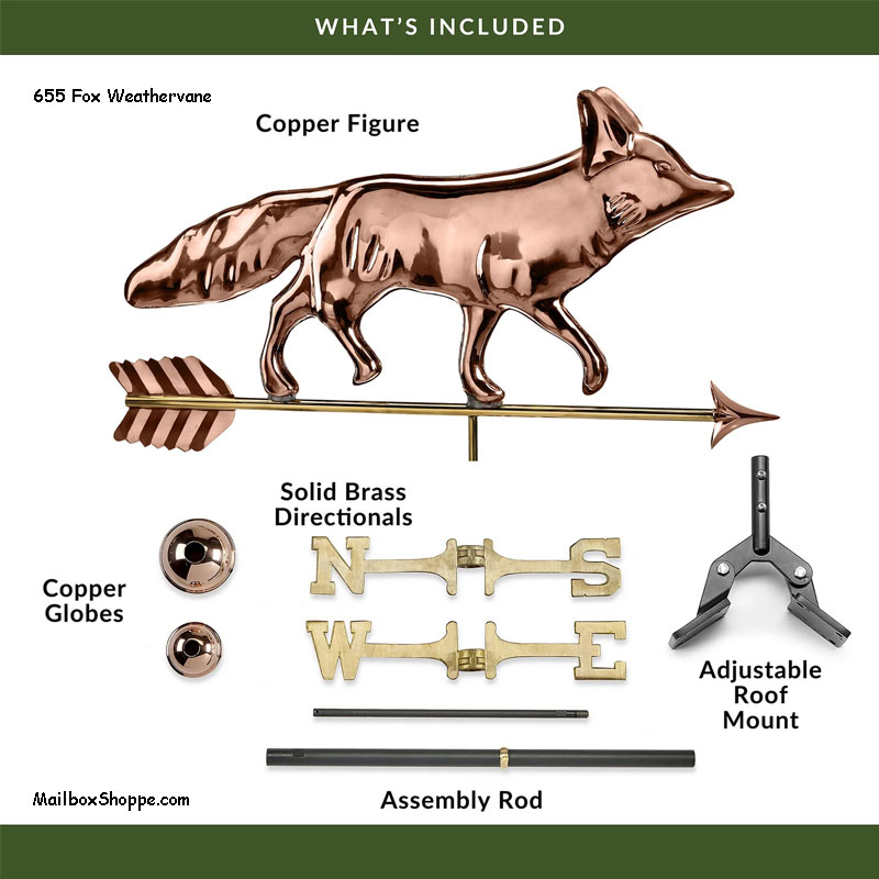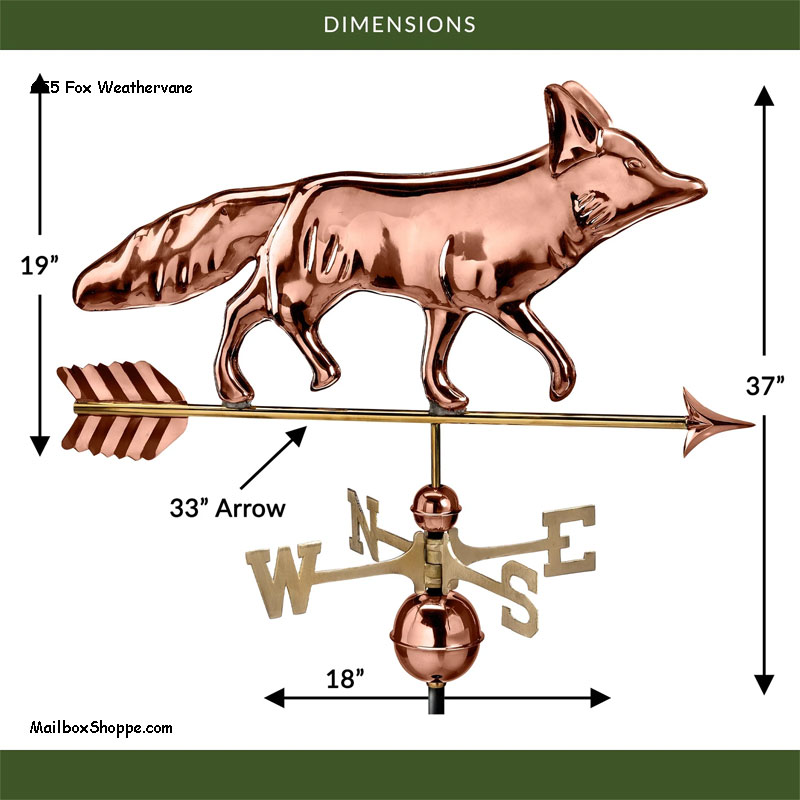 Ears and tail raised at attention, this sly fox is ready to adorn the rooftop of your home, garage, cupola, barn or gazebo. Our pure copper weathervanes have been unsurpassed in style, quality, and durability – perfect for the house-proud homeowner.