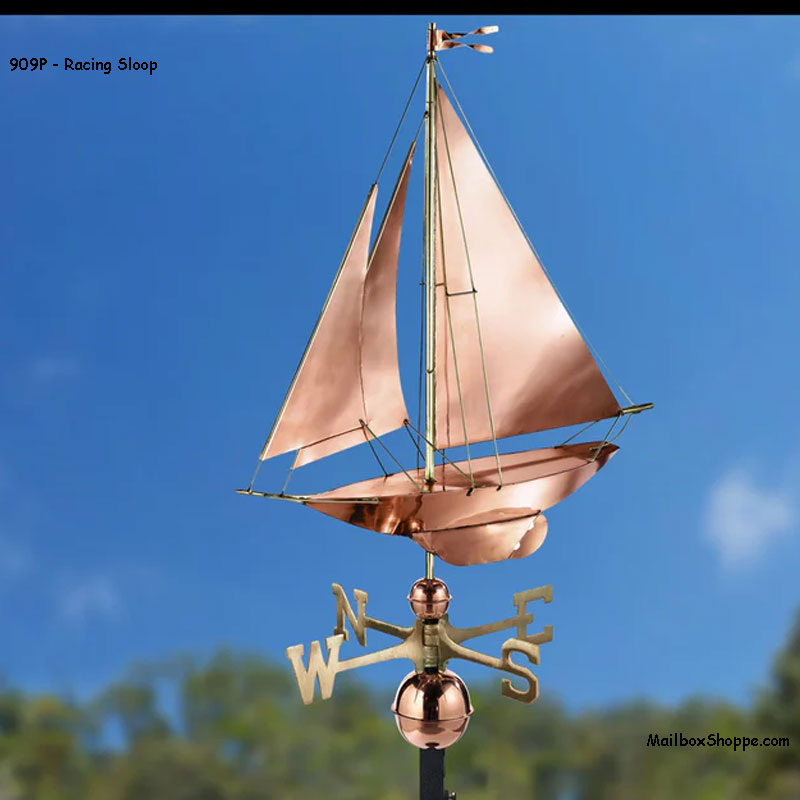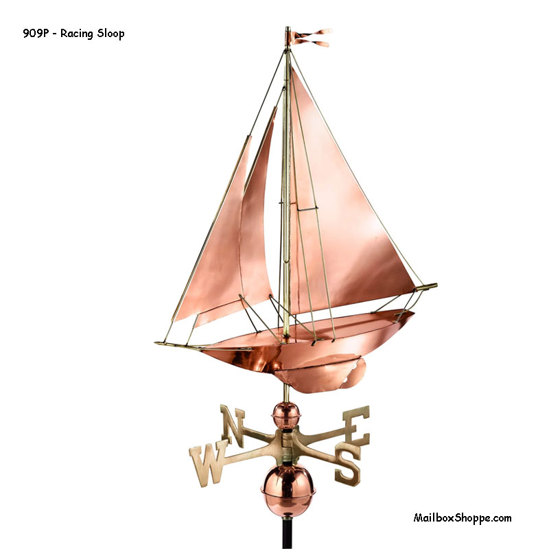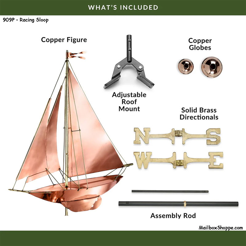 - Last seen crossing the finish line first in the America’s Cup competition, this racing sloop fills its sails from the breeze to adorn the rooftop of your home, garage, cupola, barn or gazebo. Our pure copper weathervanes have been unsurpassed in style, quality, and durability “ perfect for the house-proud homeowner. Weathervanes are easy-to-assemble and install. Includes an assembly rod, solid brass 18″L directionals, and copper globes.