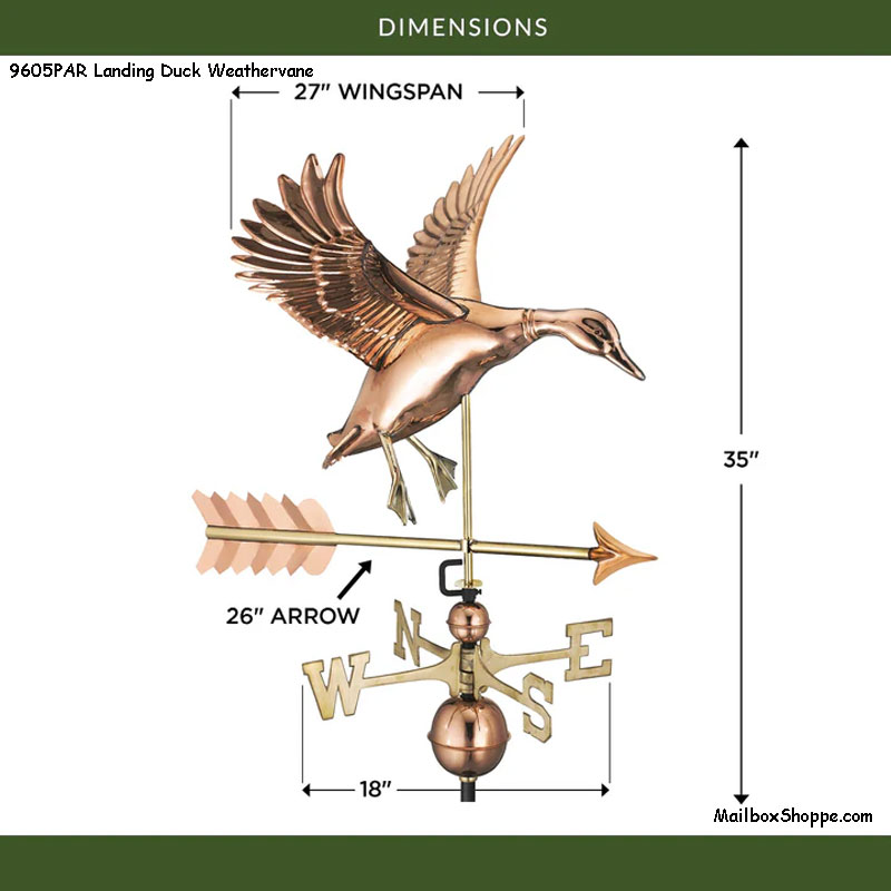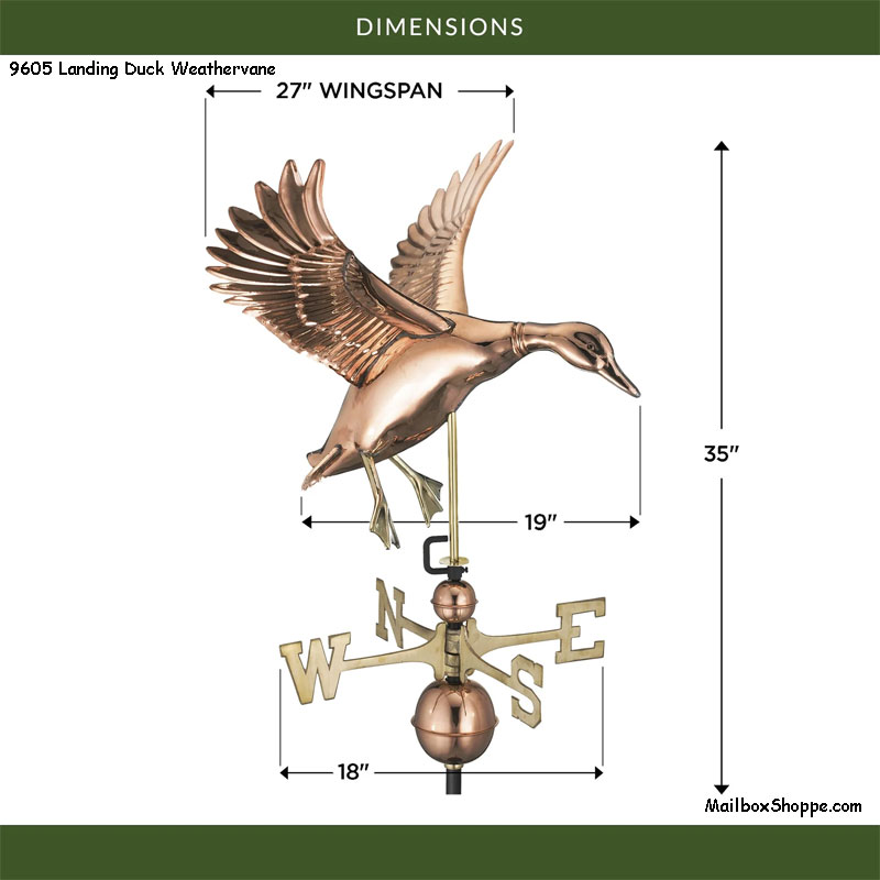 Our Landing Duck with Arrow Weathervane is an exquisite piece of art for your home. This beautiful and unique weathervane is made from intricate copper detailing, which captures the graceful movement of a duck dropping into the water. Every individual feather has been expertly crafted to create a sense of life, and beauty. Not only is this weathervane a lovely statement piece, it’s also incredibly durable “ giving you years of enjoyment and protection from the elements. The Landing Duck with Arrow Weathervane is sure to be the perfect addition to your garden or patio and will bring delight, beauty, and wonderment for many years to come.