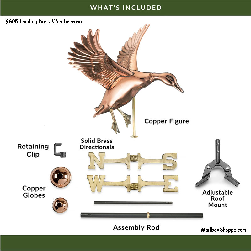 Full size weathervanes include the ornament, the directionals (N-S-E-W), and the approx 18″ long 3/4″ rod everything assembles over. In some cases, when mounting the weathervane in a cupola 30″ or wider, you will need the 11″ extension rod in order to reach the mounting bracket below the peak inside most cupolas.
