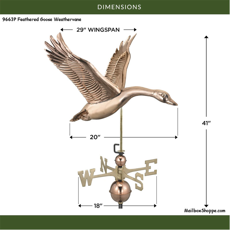 Our Feathered Goose Weathervane is a breathtaking creation that brings the magic of flight to life. It features a feathered goose with sparkling eyes, powerful wings, and regal tail feathers. Each detail is expertly crafted from the highest quality copper to create a stunning masterpiece that is truly one of a kind. Transform your rooftop into a symphony of beauty with our Feathered Goose Weathervane.