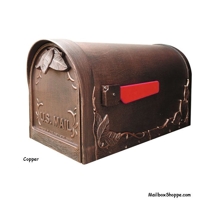 Floral Leaf Cast Mailbox: This is a nice heavy duty casting and one of our most popular post mount mailboxes. It has a recessed area under the mailbox floor (like most common post mailboxes) and the factory includes a rough pine wood mounting board.