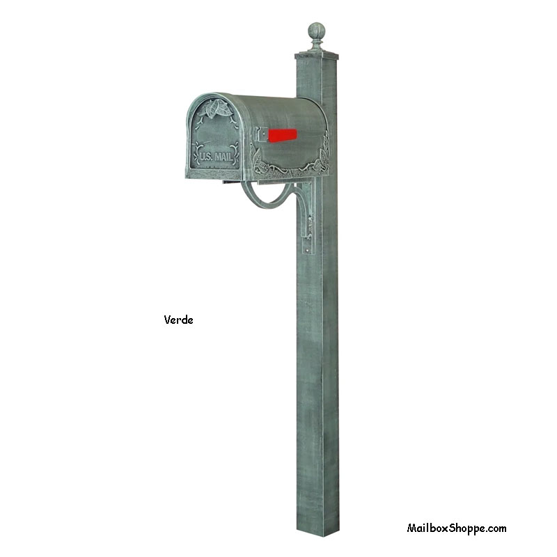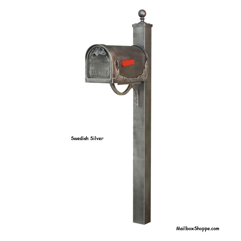 The Floral Leaf Cast Mailbox and 710 Post Combo is a solid cast aluminum post mount mailbox available in 8 colors with an optional number sign and/or newspaper holder.