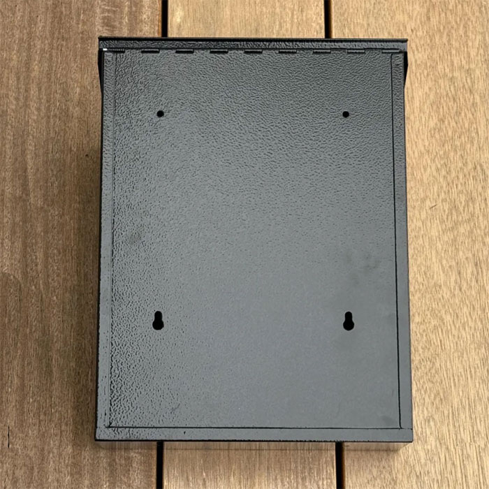 Four holes in the back panel for easier installation against any flat surface. Four screws with plastic sleeves included. We also include four rubber spaces for installations that need extra space for the mailbox lid to open and close freely.