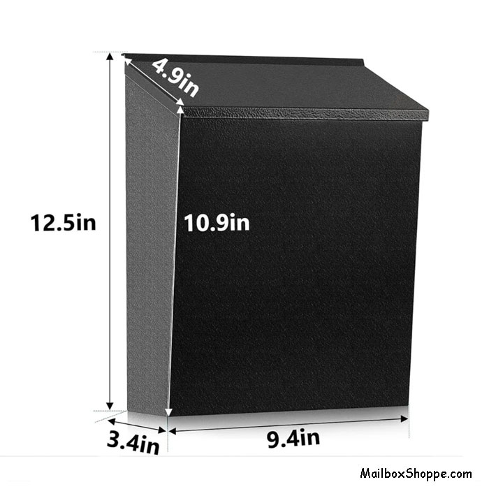 Convenient larger size mailbox measures approximately: 12.5″ tall x 9.5″ wide x 3.5″ deep.