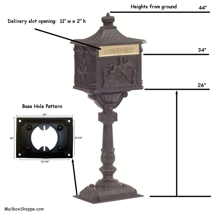 The Amco Victorian Pedestal mailbox is made from cast aluminum and painted. It has a solid brass flap that gets pushed in for the mail to be delivered. It has a key-locked back door where you retrieve your mail. Includes four keys. Installs on any flat surface (usually a small concrete pad or porch) Purchase your installation bolts locally.
